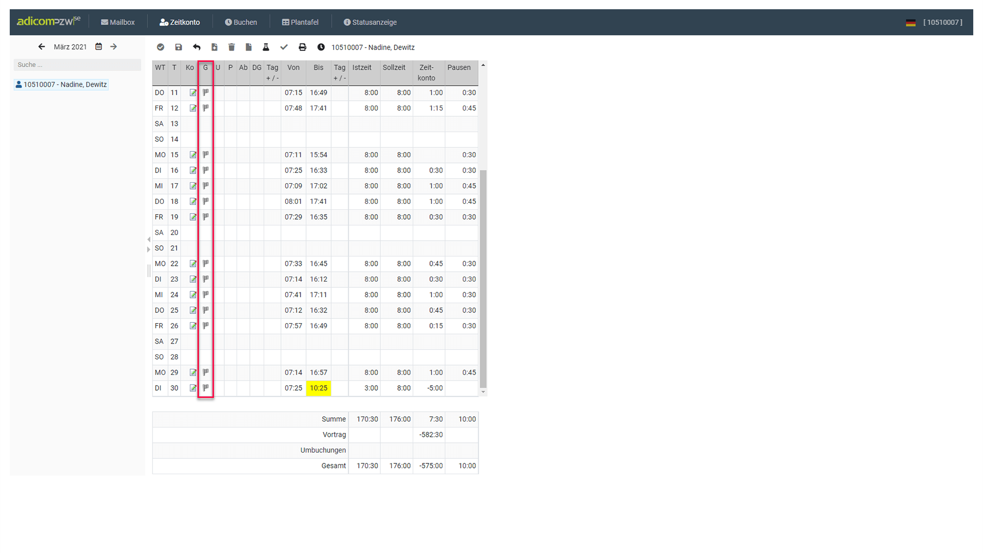 Ein blaues Fähnchen in der Spalte „G“ signalisiert den Mitarbeitern, dass die erfassten Anträge noch nicht genehmigt wurden. Im folgenden Beispiel ist zu sehen, dass ein(e) Mitarbeiter(in) seine/ihre Buchungen manuell angelegt hat und dafür die Genehmigung noch aussteht.
