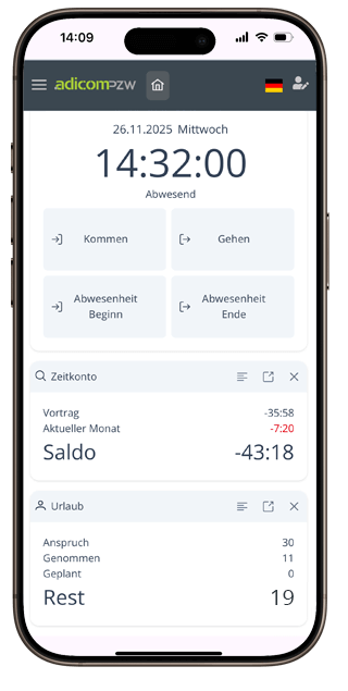 Alle erfassten Zeiten sind sofort im .adicomPZW|se System verfügbar.